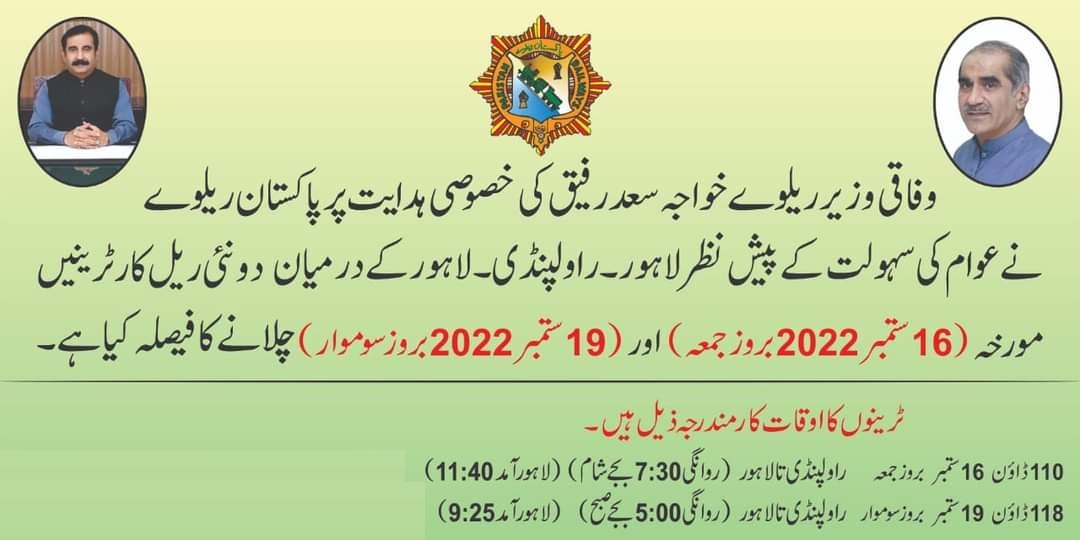 Starting two new trains between Lahore-Rawalpindi-Lahore from 16-09-2022