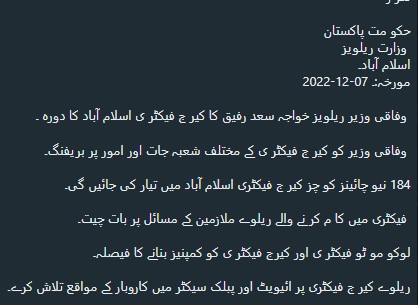 Minister for Railways, Khawaja Saad Rafique visited Carriage Factory Islamabad